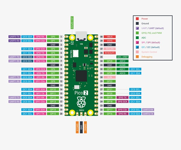 - 2x UART, 2x I2C, 2x SPI, hasta 16 canales PWM, 12x máquinas de estado PIO