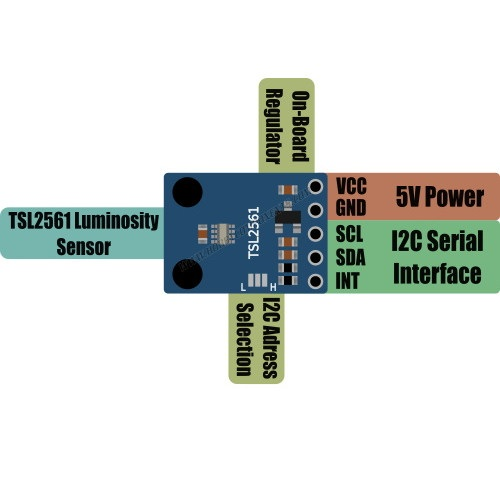 Tarjeta sensor basada en el TSL2561 que mide tanto la luz infrarroja como la visible para aproximarse mejor a la respuesta del ojo humano. Es un sensor de luz digital que tiene una respuesta plana en la mayor parte del espectro visible, y debido a que es un sensor integrador (absorbe la luz durante una cantidad de tiempo predeterminada), es capaz de medir cantidades peque帽as y grandes de luz cambiando el tiempo de integraci贸n.