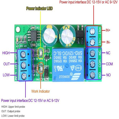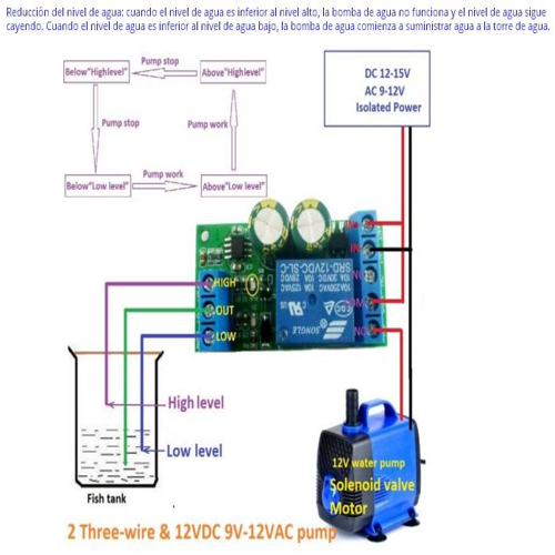 Tarjeta controladora de nivel y de bomba de agua. Con salida a relé, voltaje de funcionamiento 12 a 15VDC