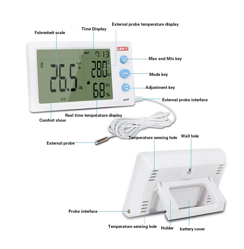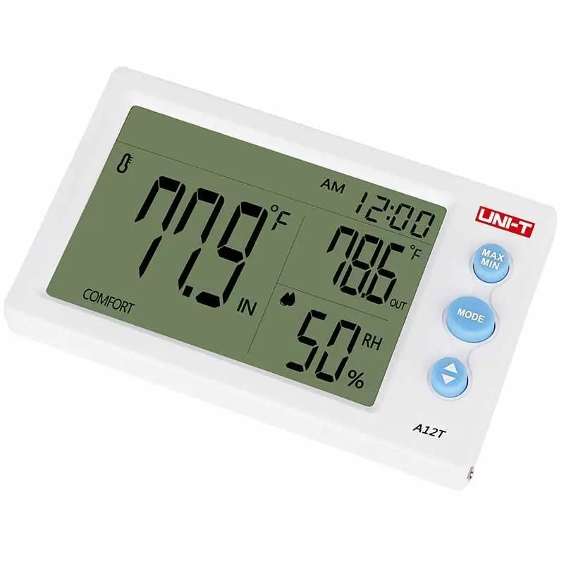 Medidor de Humedad y temperatura. Rango temperatura -10 a 50 grados centígrados, Humedad 10% - 99%, humedad relativa, muestra la temperatura en el ambiente interno y externo