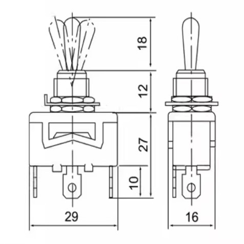 Este es un interruptor de palanca DPST (doble polo, un solo tiro), de 3 pines, diseño de 3 posiciones. Un interruptor DPST se utiliza a menudo para conmutar la red eléctrica porque puede aislar tanto las conexiones activas como las neutras.