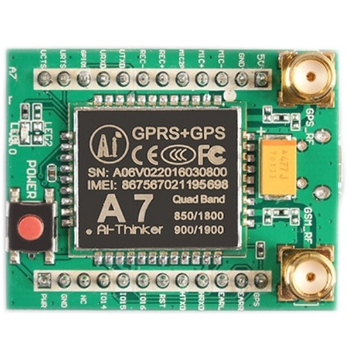 M贸dulo de comunicaci贸n que integra en un solo dispositivo un m贸dem GSM/GPRS y un receptor GPS. El m贸dulo A7 permite realizar y recibir llamadas de voz, recepci贸n y env铆o de mensajes SMS y tambi茅n conectarse a Internet mediante GPRS. Incluye socket para tarjeta SIM, puerto microUSB y conectores para antenas.