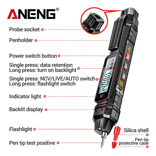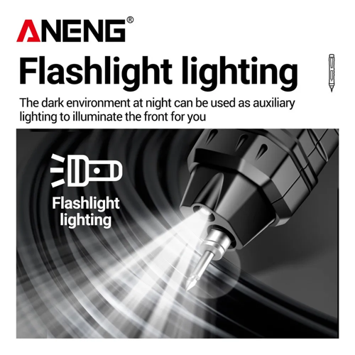 Con funci贸n de linterna: el mult铆metro tipo bol铆grafo tiene una linterna brillante en la punta que te ayuda a iluminar eficazmente las zonas oscuras y dif铆ciles de ver, lo que te permite trabajar con facilidad en entornos con poca luz. Con su dise帽o ergon贸mico y su tama帽o port谩til, la linterna se puede llevar a cualquier parte, lo que te da la flexibilidad de trabajar en una variedad de entornos diferentes.